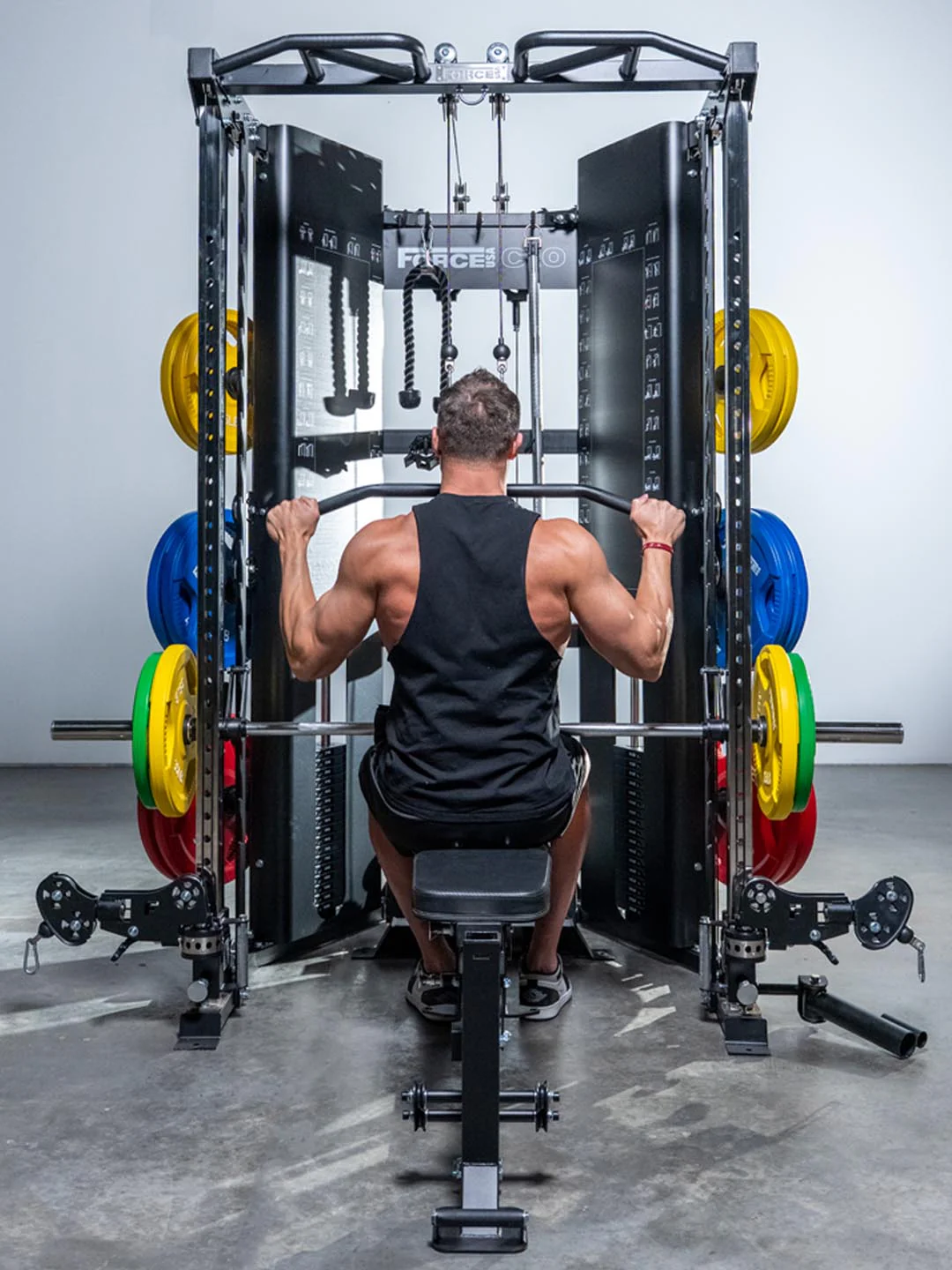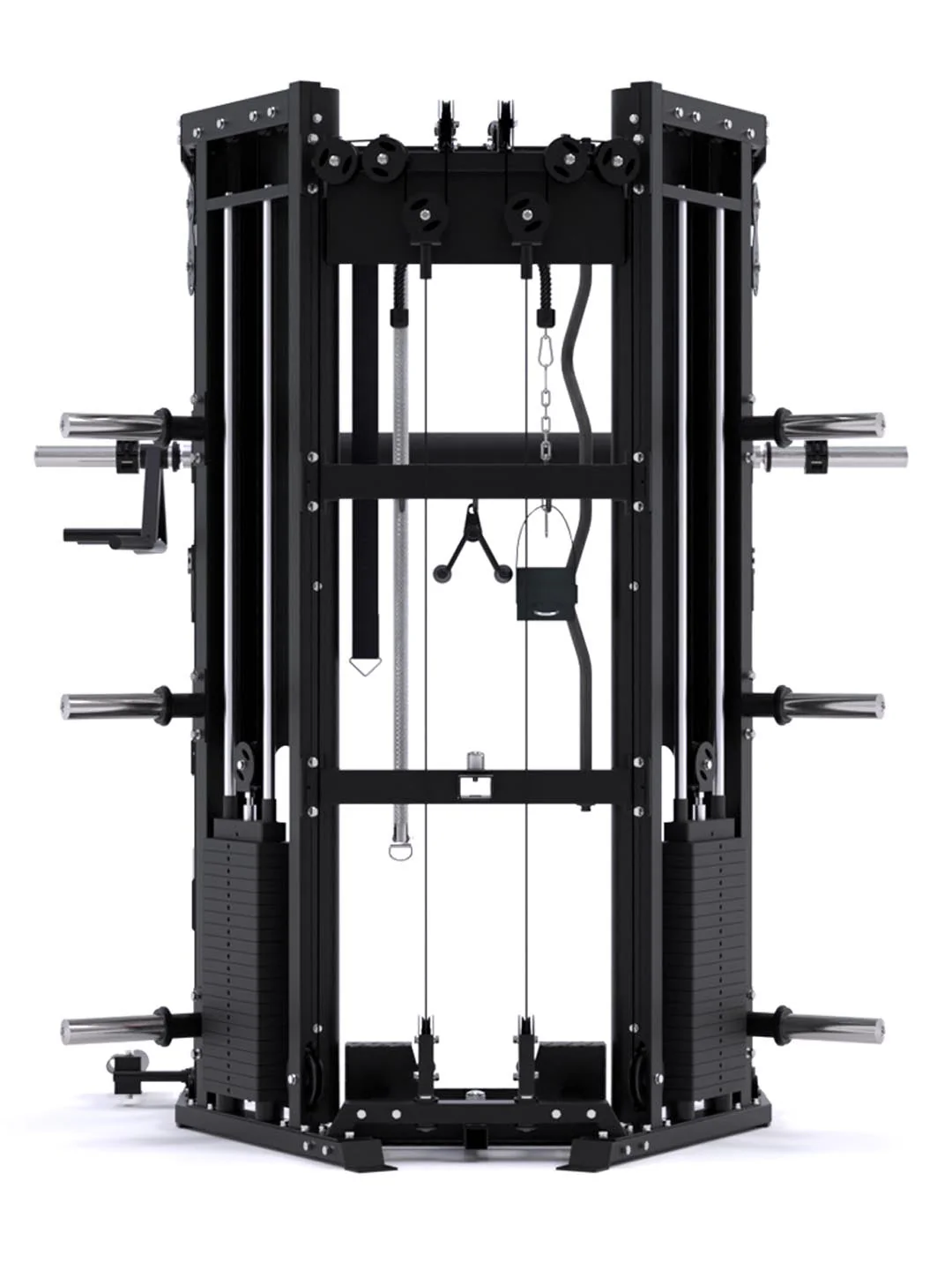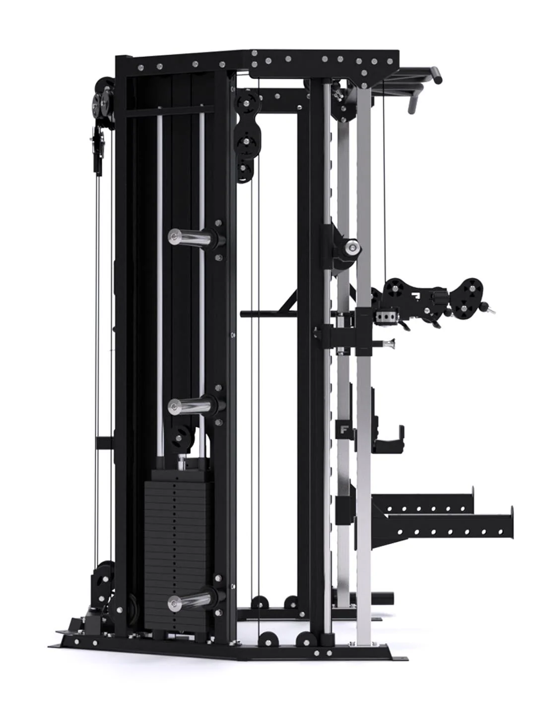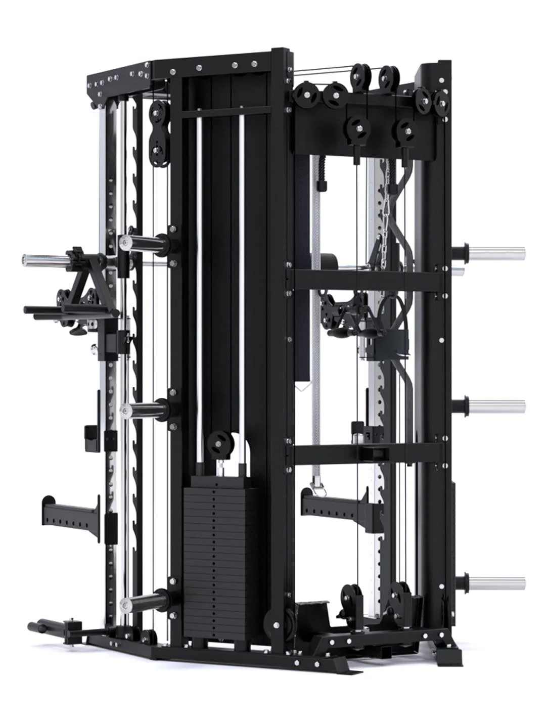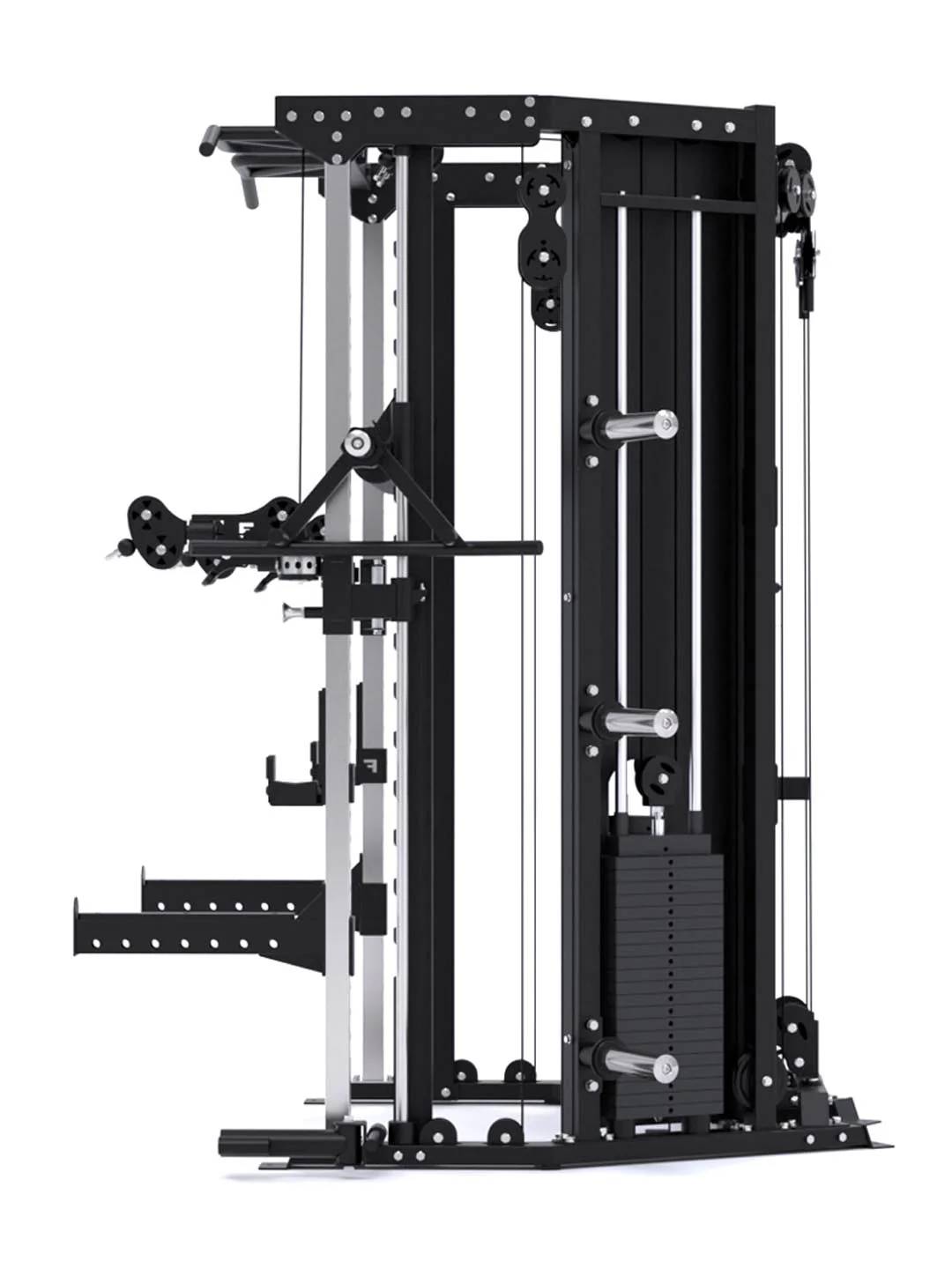 The innovation doesn’t stop there. Two 200° swivel pulley trolleys glide at a smooth 2:1 ratio, plus two upper (1:1/2:1) and two lower (1:2/1:1) pulleys deliver true 90° lat pulldowns and low rows. And that’s just the cables. The C10 is also a Power Rack, Smith machine, Suspension Trainer, Landmine, Lat pulldown, Low row, and more. Engineered into a corner-friendly design that doesn’t just fit your space—it defines it.